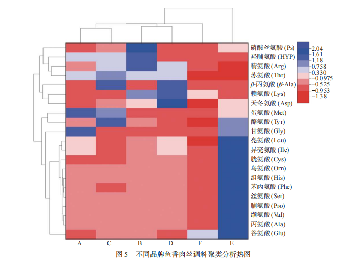 將游離氨基酸采用歸一化法繪制聚類(lèi)熱圖,結(jié)果如圖 5 所示。由圖 5 可見(jiàn),21 種氨基酸可分為2 個(gè)大聚類(lèi),其中聚類(lèi) 1 大部分是由苦味和無(wú)味氨基酸組成,聚類(lèi) 2 大部分則是由甜味和鮮味氨基酸組成。同時(shí),不同調(diào)料的聚類(lèi)可分為 2 個(gè)大聚類(lèi),其中大聚類(lèi) 1 為樣品 E,聚類(lèi) 2 由其它 5 種調(diào)料組成,說(shuō)明樣品 E 與其它樣品的滋味差異明顯。