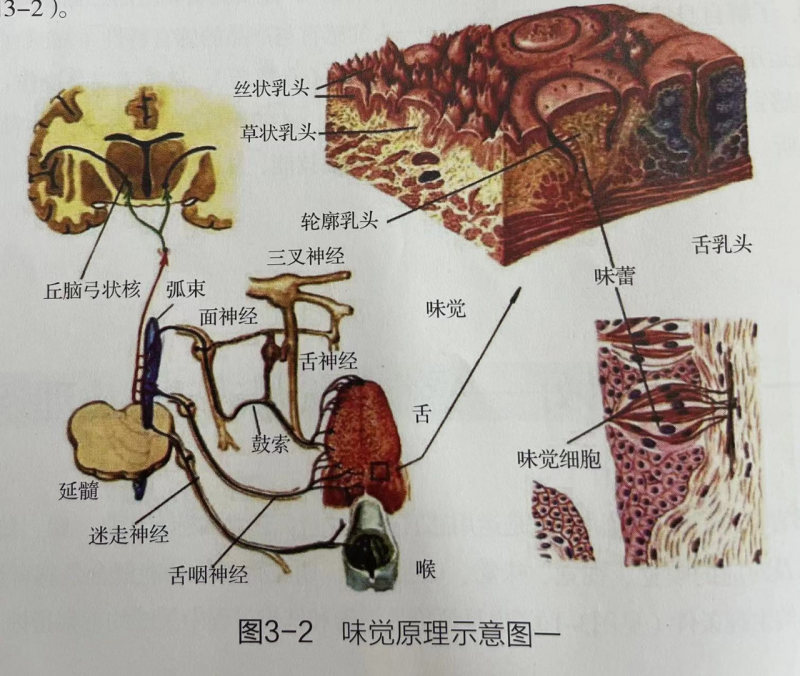 可溶性呈味物質進入口腔后,在舌肌作用下與味蕾接觸,刺激味蕾中的味細胞產生神經沖動,以脈沖的形式通過神經系統(tǒng)傳至大腦皮層味覺中樞后產生味覺(圖3-2)。