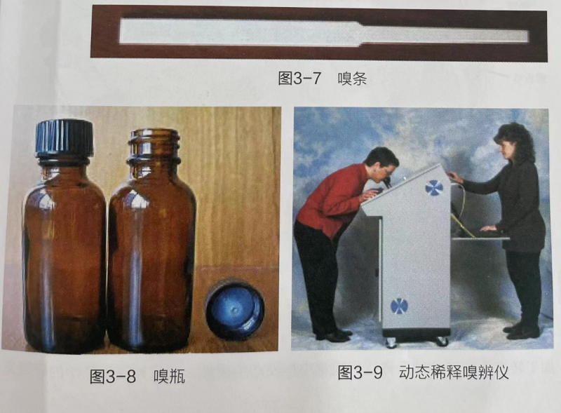常見氣味辨識可以盛裝嗅聞物質的嗅瓶或蘸取嗅聞物質的嗅條為工具開展(圖3-7和圖3-8),嗅覺網值測定則可采用動態(tài)稀釋嗅辨儀(圖3-9)。