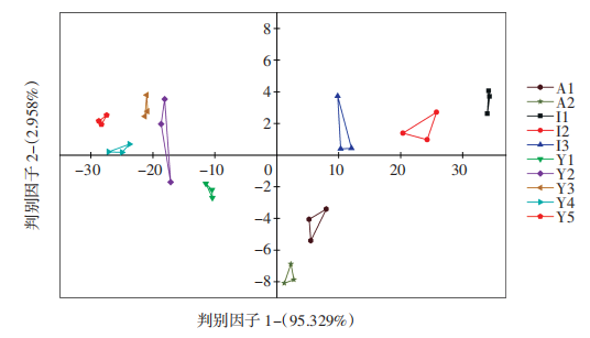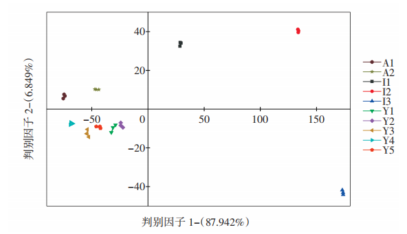 對(duì)10種辣木籽電子鼻數(shù)據(jù)進(jìn)行DFA結(jié)果分析,見(jiàn)圖5。由圖5可知,I1、I2和I3分布在DF1正半軸,A1與A2分布在第二象限內(nèi),Y1、Y2、Y3、Y4和Y5則分布在第三象限內(nèi),說(shuō)明同一品種辣木籽的氣味相近,不同品種之間氣味上有較大差異。3個(gè)品種辣木籽響應(yīng)值分布在不同區(qū)域內(nèi)且無(wú)重疊,因此可用于判別不同品種辣木籽,與色譜圖分析一致。