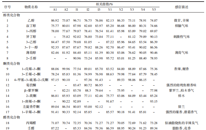 表2 10種辣木籽的氣味成分、相關(guān)指數(shù)及感官描述