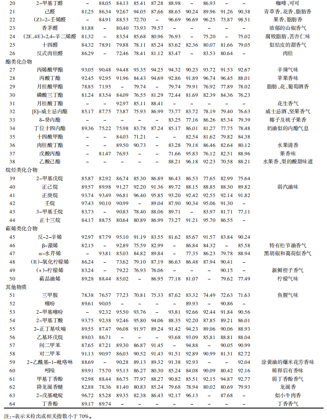 氣味成分分析10種辣木籽的氣味成分、相關(guān)指數(shù)及感官描述見(jiàn)表2。由表2可知,10種辣木籽共檢出64種氣味物質(zhì)成分,其中醇類化合物8種,酮類化合物9種,醛類化合物9種,酯類化合物12種,烷烴類化合物6種,萜烯類化合物6種,其他類化合物14種。