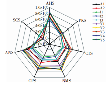 每種辣木籽樣品做3次平行試驗(yàn),計(jì)算味覺(jué)傳感器響應(yīng)強(qiáng)度的平均值,得到雷達(dá)圖見(jiàn)圖6。由圖6可知,I1、I2和I3,A1和A2,Y1、Y2、Y3、Y4和Y5辣木籽樣品的各傳感器響應(yīng)強(qiáng)度數(shù)值接近,表明同一品種辣木籽的滋味相似;同時(shí),傳感器AHS、CTS、NMS、CPS、ANS和SCS對(duì)不同品種辣木籽樣品的響應(yīng)值離散程度較大,說(shuō)明這6種傳感器能較好區(qū)分不同品種辣木籽。