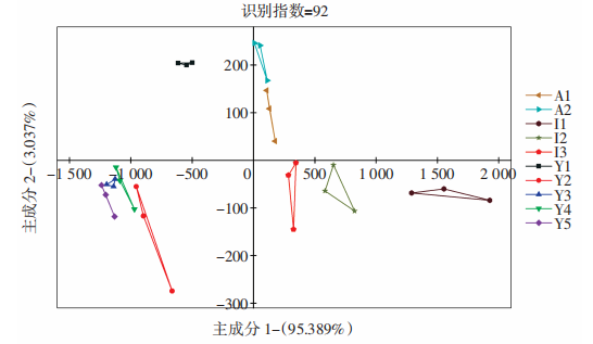 PCA結(jié)果分析10種辣木籽電子舌PCA結(jié)果見(jiàn)圖7。由圖7可知,識(shí)別指數(shù)為92,說(shuō)明電子舌對(duì)10種辣木籽滋味有良好區(qū)分度;主成分1貢獻(xiàn)率95.389%,主成分2貢獻(xiàn)率3.037%,累積貢獻(xiàn)率為98.426%,說(shuō)明2種主成分可以反映出辣木籽整體滋味。中國(guó)云南改良品種的Y1、Y2、Y3、Y4、Y5分布于DF1負(fù)半軸,非洲品種的A1、A2集中在第一象限,印度傳統(tǒng)品種的I1、I2、I3集中于第四象限,說(shuō)明不同品種辣木籽的滋味有很大差異,而同一品種間滋味相近,與雷達(dá)圖分析結(jié)果一致。