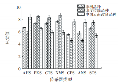 味覺(jué)分析3個(gè)品種辣木籽的味覺(jué)分析結(jié)果見(jiàn)圖9。由圖9可知,中國(guó)云南改良品種辣木籽有明顯酸甜滋味,可能與其中酯類成分較多有關(guān);印度傳統(tǒng)品種辣木籽具有苦咸鮮口感,可能是由于辣木籽中含有較多刺激性成分;非洲品種辣木籽各傳感器味覺(jué)值適中,滋味更為豐富,電子舌的味覺(jué)分析進(jìn)一步印證了電子鼻的風(fēng)味成分檢測(cè)結(jié)果。