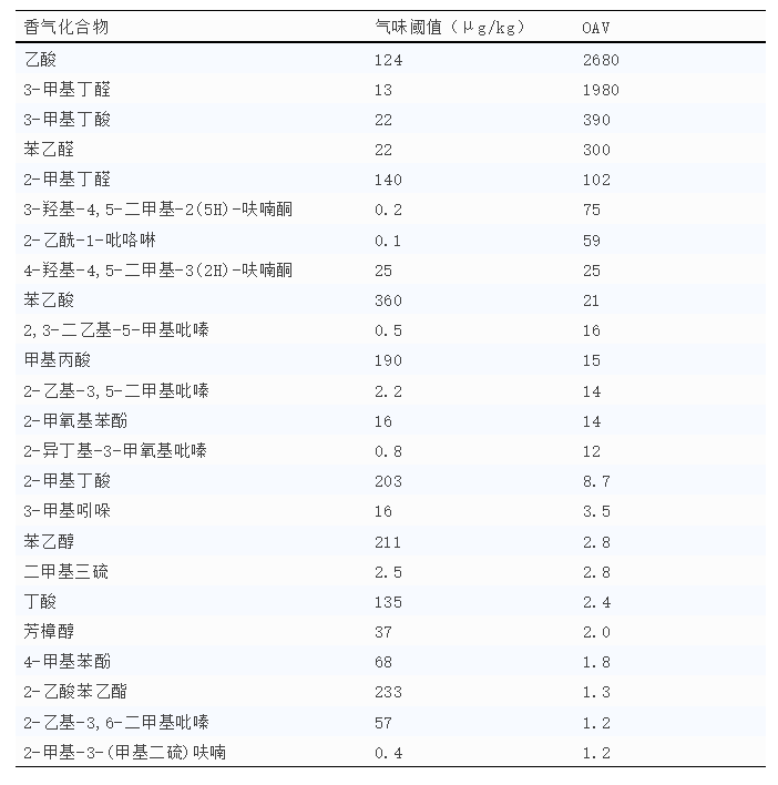表1 可可粉中關(guān)鍵香氣化合物的氣味閾值和氣味活度值(OAV)