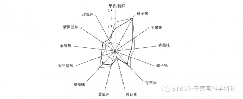 圖1 新鮮杏子的香氣輪廓圖(黑色)和香氣重組(灰色)