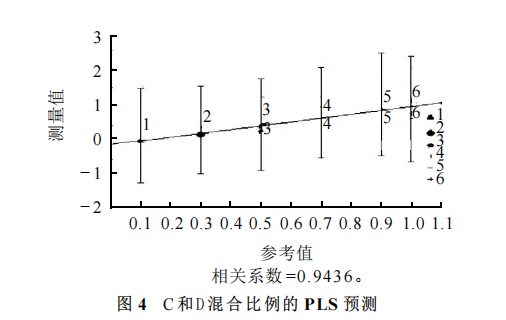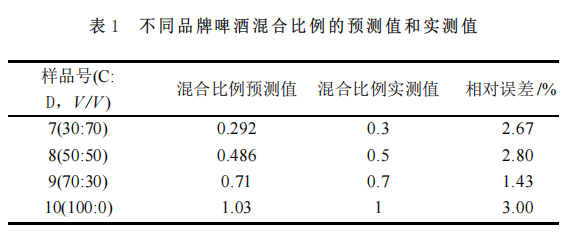 分別以C和D不同混合比例的4個(gè)樣品進(jìn)行模型的驗(yàn)證,結(jié)果見(jiàn)表1 。PLS 模型對(duì)混合比例為30:70 、50:50 、70:30 、100:0 的4個(gè)樣品預(yù)測(cè)效果較好,相對(duì)誤差在1.43%~3.00 %之間。說(shuō)明 PLS 模型能夠很好地預(yù)測(cè)不同品牌啤酒的混合比例。