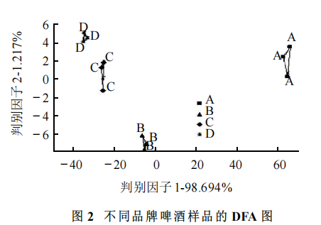 圖1為不同品牌啤酒樣品的主成分分析圖, 第一主成分和第二主成分的總貢獻(xiàn)率達(dá)到了95 .2% ,足以收集特征性信息。不同品牌的啤酒分別聚類在 PCA 圖中的不同區(qū)域,相互之間能夠較好地區(qū)分。