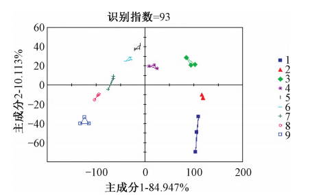 懷區(qū)9種不同主栽品種懷地黃RSD分別為0.42%、1.35%、0.56%、0.34%、0.42%、0.22%、0.22%,樣品3次重復(fù)間相對(duì)標(biāo)準(zhǔn)偏差都比較小,說(shuō)明樣品在重復(fù)測(cè)試過(guò)程中電子舌儀器的穩(wěn)定性、重現(xiàn)性好。由圖5可知,PC1與PC2的貢獻(xiàn)率之和達(dá)到了95.060%,其識(shí)別指數(shù)為93,說(shuō)明這9種生地黃樣品滋味能夠快速地通過(guò)電子舌很好區(qū)分開來(lái)。在主成分分析圖中,樣品間的相對(duì)距離越近,則樣品整體滋味越接近,其中“金九”與“85?5”樣品的相對(duì)距離最近,滋味差別最??;“噸王”與“沁懷”的相對(duì)距離最遠(yuǎn),滋味差別最大。