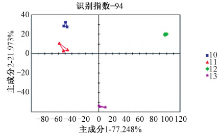采用Alpha soft軟件對(duì)所得數(shù)據(jù)進(jìn)行分析,利用主成分分析(PCA)法,通過(guò)對(duì)原始數(shù)據(jù)向量進(jìn)行線性變換,對(duì)多個(gè)數(shù)據(jù)進(jìn)行降維處理,轉(zhuǎn)化為少數(shù)綜合指標(biāo)。