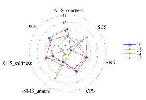 采用第6套傳感器系統(tǒng),包括AHS、PKS、CTS、NMS、CPS、ANS、SCS共7根傳感器。選擇Ag/AgCl作為參比電極,通過(guò)軟件對(duì)信號(hào)值的分析,能夠在0到12的刻度上比較不同樣品間的各種滋味的相對(duì)強(qiáng)度。將生地黃樣品粉碎,過(guò)5號(hào)篩,稱?。玻绶勰┯跓?,加入50mL60℃蒸餾水,超聲處理30min,靜置1h,濾紙過(guò)濾后取25mL置于電子舌專用燒杯中待測(cè),重復(fù)3次,每檢測(cè)1個(gè)樣品后對(duì)傳感器進(jìn)行1次徹底清洗。樣品采集時(shí)間為120s,每次分析時(shí)間為180s。