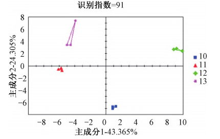 由圖4可知,PC1與PC2的貢獻(xiàn)率之和達(dá)到了95.057%,其識(shí)別指數(shù)達(dá)到99,說(shuō)明基于氣味上的差異能有效區(qū)分不同產(chǎn)地地黃樣品。河南溫縣與甘肅所產(chǎn)“北京3號(hào)”各單獨(dú)分布在一個(gè)區(qū)域,與其他產(chǎn)區(qū)氣味差別較大;山西與陜西所產(chǎn)“北京3號(hào)”氣味差別較小,利用AroChemBases數(shù)據(jù)庫(kù)對(duì)篩選出的差異較大的色譜峰進(jìn)行定性可知,生地黃氣味差異可能由于乙醛、乙醇、2,3?丁烷、乙腈、己醛等揮發(fā)性氣體含量差異引起,說(shuō)明使用電子鼻能迅速區(qū)分同一品種不同產(chǎn)地生地黃。
