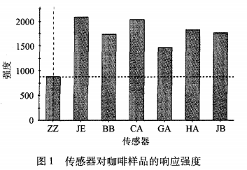 該 實(shí) 驗(yàn) 所 用 的 傳 感 器 為 非 特 異 性 、交 互 敏 感 型 傳 感器 。7個 傳 感 器 分 別 是 zz、JE、BB、CA、GA、HA 和 JB。各 傳 感 器 對 風(fēng) 味 物 質(zhì) 普 遍 響 應(yīng) ,沒 有 絕 對 的 對 應(yīng) 關(guān) 系 。圖 1表 示 傳 感 器 對 咖 啡 樣 品 的 響 應(yīng) 強(qiáng) 度 圖 ,其 中 JE 和 CA 對 咖 啡 樣 品 的 響 應(yīng) 強(qiáng) 度 最 大 ,傳 感 器 響 應(yīng) 強(qiáng) 度 JE>CA>HA>JB。