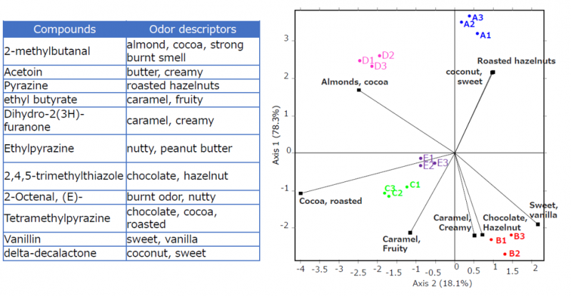 通過TDS持續(xù)時(shí)間生成的主成分分析圖:A,B,C,D,E 這幾個(gè)樣品都有不同的感官特征,比如A產(chǎn)品的榛子味濃一些,C產(chǎn)品的烤可可味更濃一些。