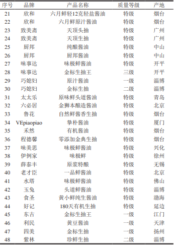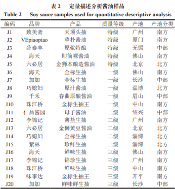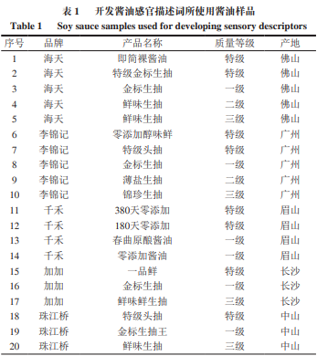 醬油是我國(guó)食用歷史悠久的傳統(tǒng)調(diào)味品之一,不僅具有明亮棕紅色的顏色,濃郁的醬香、醇香、焦糖香等 香氣,鮮味、咸味、甜味、濃厚味等綜合味感,能改善食物的色、香、味,還富含類黑精、呋喃類化合物、異黃酮類化合物、大豆多肽等多種功能性活性物質(zhì),具有一定的抗氧化、降血壓和提高免疫力等生理功能,現(xiàn)已成為世界性的大宗調(diào)味品。 我國(guó)釀造醬油是以大豆和/或脫脂大豆、小麥和/或麩皮為主要原料,經(jīng)蒸煮、曲霉菌制曲后與鹽水混合成稀醪或固態(tài)醬醅,再經(jīng)微生物(如霉菌、酵母菌、細(xì)菌、乳酸菌等)發(fā)酵制成。根據(jù)醬油中的可溶性無鹽固形物、全氮和氨基酸態(tài)氮含量,將醬油分為4 個(gè)級(jí)別,即特級(jí)、一級(jí)、二級(jí)和三級(jí)。作為調(diào)味品,醬油的風(fēng)味是決定醬油品質(zhì)的重要指標(biāo),更是影響消費(fèi)者購(gòu)買行為的關(guān)鍵要素。近些年來,關(guān)于中國(guó)釀造醬油中揮發(fā)性關(guān)鍵風(fēng)味物質(zhì)和滋味化合物的研究有很多,然而單一的化合物并不能與香氣或滋味簡(jiǎn)單地對(duì)應(yīng),因?yàn)槭称返母泄僬魇嵌喾N化合物在人嗅覺和味覺受體上反應(yīng)的綜合感受,因此感官分析不可替代,且在產(chǎn)品質(zhì)量評(píng)價(jià)中具有重要的作用。風(fēng)味輪是一種可用于描述產(chǎn)品不同風(fēng)味特征的可 視化實(shí)用工具,通過對(duì)具體感官屬性描述詞的收集、分類、歸納和整理,形成產(chǎn)品的風(fēng)味特征。風(fēng)味輪可以讓生產(chǎn)者、銷售者、消費(fèi)者等方便地認(rèn)識(shí)、研究和應(yīng)用產(chǎn)品的風(fēng)味性質(zhì),在產(chǎn)品研發(fā)、質(zhì)量控制、風(fēng)味營(yíng)銷等方面發(fā)揮著重要的作用。 1、醬油樣品 釀造醬油樣品均隨機(jī)從市場(chǎng)購(gòu)買,且均采用高鹽稀態(tài)發(fā)酵工藝。開發(fā)醬油感官描述詞所用樣品共48 個(gè)(表1),包括我國(guó)釀造醬油的主要品牌,代表了中國(guó)釀造醬油的主要特色。感官定量描述分析所使用醬油樣品共20 種(表2),涵蓋了不同等級(jí)、不同產(chǎn)地的各類釀造醬油樣品。