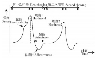 質(zhì)地剖面分析測試原理是模擬人體口腔咀嚼運(yùn)動(dòng),通過對(duì)樣品2次擠壓進(jìn)行測定。質(zhì)地剖面分析曲線見圖1。咀嚼性為硬度、凝聚力和彈性3個(gè)參數(shù)值的乘積,常作為質(zhì)地結(jié)構(gòu)綜合指標(biāo)。