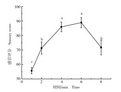 以色澤、氣味、滋味、口感為指標(biāo)對(duì)不同蒸制時(shí)間下的脊尾白蝦進(jìn)行感官評(píng)價(jià)。在蒸制的前4min,脊尾白蝦的綜合評(píng)分呈直線上升,4~6min變化不顯著(P>0.05);當(dāng)蒸制時(shí)間為6min時(shí),綜合感官評(píng)分最高;在蒸制8min時(shí)蝦體色澤暗淡,蝦體有所損壞,綜合評(píng)分下降(圖2)。
