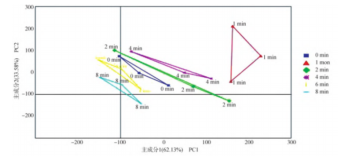 圖4脊尾白蝦不同蒸制時(shí)間的主成分分析