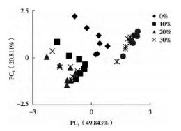 核桃油中摻入菜籽油的PCA分析圖如圖2所示。結(jié)果表明,第1主成分(PC1)的貢獻(xiàn)率為49.843%,第2主成分(PC2)的貢獻(xiàn)率為20.811%,2個(gè)主成分的總貢獻(xiàn)率達(dá)到70.654%(>70%),表明所提取的信息能夠反映原始數(shù)據(jù)的大部分信息。純核桃油和其他摻假樣品的數(shù)據(jù)點(diǎn)分布較遠(yuǎn),區(qū)分明顯,但是摻入菜籽油質(zhì)量分?jǐn)?shù)10%~50%的摻假樣品的數(shù)據(jù)點(diǎn)分布較接近,各區(qū)域重疊嚴(yán)重,難以區(qū)分。這說(shuō)明電子舌技術(shù)結(jié)合PCA分析方法可將摻假核桃油與純核桃油區(qū)分開來(lái)。