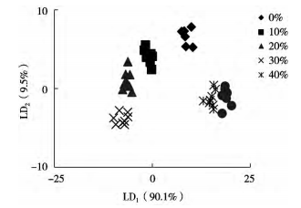 核桃油中摻入菜籽油的LDA分析圖如圖3所示。結(jié)果表明,純核桃油和其他摻假樣品的數(shù)據(jù)點(diǎn)分布較遠(yuǎn),菜籽油質(zhì)量分?jǐn)?shù)0~50%的摻假樣品之間也區(qū)分明顯。核桃油中摻入菜籽油的含量不同,分布也不同,且分布位置隨著菜籽油含量的增多呈現(xiàn)逆時(shí)針的變化,這表明不同摻假樣品在菜籽油摻入質(zhì)量分?jǐn)?shù)大于10%時(shí)即能區(qū)分開來(lái),且能通過(guò)摻假樣品在LDA分析圖中的位置判斷出摻入菜籽油的質(zhì)量分?jǐn)?shù),這表明電子舌技術(shù)結(jié)合LDA分析方法既能對(duì)核桃油中摻入菜籽油的現(xiàn)象進(jìn)行定性分析,也可對(duì)其進(jìn)行定量分析。