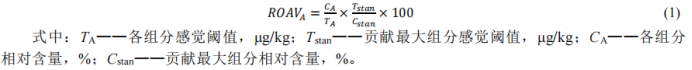 利用ROAV定義對(duì)樣品風(fēng)味貢獻(xiàn)最大的揮發(fā)性風(fēng)味物質(zhì),即ROAVmax=100,其它揮發(fā)性成分ROAV按式(1)計(jì)算。