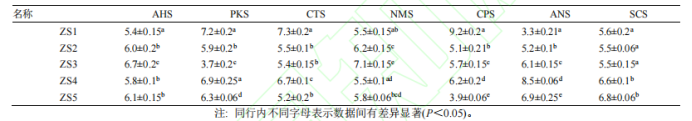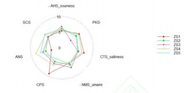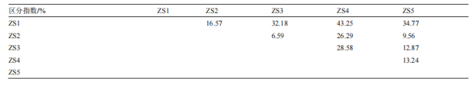 表1是5個(gè)不同品種抓飯電子舌區(qū)別指數(shù)分析,ZS2、ZS3、ZS5區(qū)別指數(shù)分別為6.59,9.56,12.87,距離值最小,可知三者味覺(jué)的相似性較大。ZS1和ZS4的距離值最大43.25,可知兩者的相似性最小。