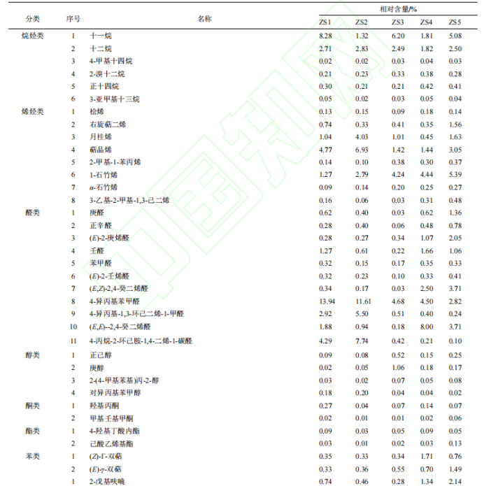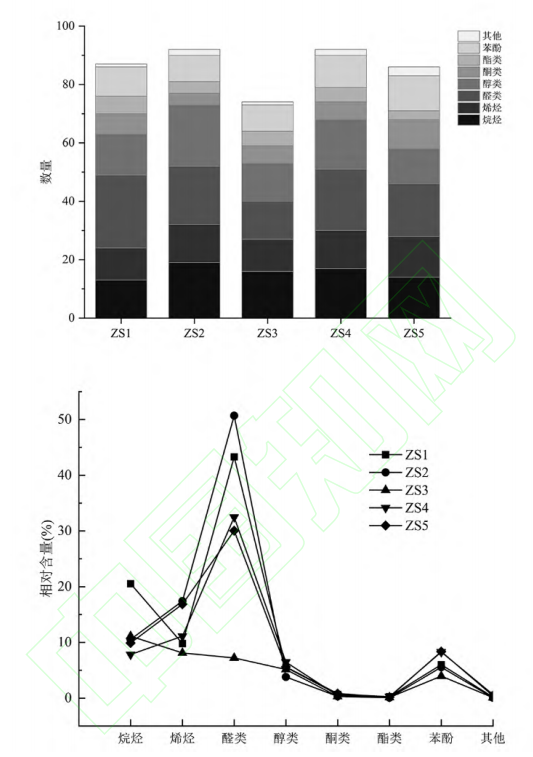 5種市售抓飯共鑒定出132種化合物,其中包括烷烴(25種)、烯烴(16種)、醛類(27種)、醇類(26種)、酮類(11種)、酯類(9種)、苯酚類(15種)、其它(3種)。從圖4可以看出,ZS1鑒定出87種,其中醛類(43.31%)、烷烴(20.54%)相對(duì)含量較高;ZS2鑒定出92種,其中醛類(50.68%)、烯烴(17.41%)、烷烴(10.53%)相對(duì)含量較高;ZS3鑒定出74種,其中烷烴(11.11%)、烯烴(8.11%)相對(duì)含量較高;ZS4鑒定出92種,其中醛類(32.47%)、烯烴(11.12%)相對(duì)含量較高;ZS5鑒定出86種,其中醛類(30.04%)烯烴(16.85%)相對(duì)含量較高。