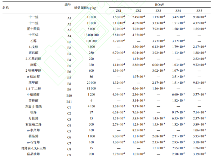 表4 抓飯揮發(fā)性風(fēng)味物質(zhì)的香氣閾值及ROAV