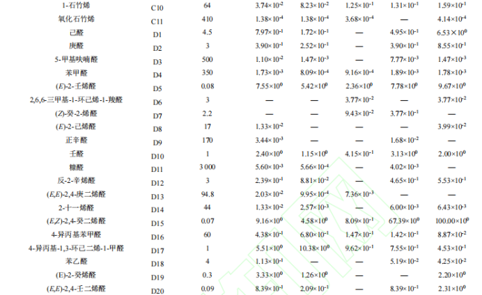 根據(jù)文獻(xiàn)查閱感覺(jué)閾值并計(jì)算抓飯香氣成分ROAV,本研究只針對(duì)能查到感覺(jué)閾值的化合物。篩選ROAV大于0.1的揮發(fā)性物質(zhì)分析,結(jié)果如表4所示,(E,Z)-2,4-癸二烯醛對(duì)抓飯香氣貢獻(xiàn)最大,定義其為ROAVmax=100,ROAV≥1的物質(zhì)對(duì)抓飯香氣貢獻(xiàn)較大,0.1≤ROAV<1的物質(zhì)對(duì)抓飯香氣有重要的修飾作用。月桂烯、1-石竹烯、己醛、庚醛、(E)-2-壬烯醛、反-2-辛烯醛、壬醛、(E,Z)-2,4-癸二烯醛、4-異丙基苯甲醛、4-異丙基-1,3-環(huán)己二烯-1-甲醛、苯乙醛、(E)-2-癸烯醛、(E,E)-2,4-壬二烯醛、(E,E)-2,4-癸二烯醛、(E)-2-庚烯醛、α-紫羅酮、β-紫羅酮、2-正戊基呋喃18種化合物ROAV大于0.1,為抓飯香氣主要香氣成分。其中(E,Z)-2,4-癸二烯醛、(E,E)-2,4-癸二烯醛、4-異丙基-1,3-環(huán)己二烯-1-甲醛、(E)-2-癸烯醛、壬醛、(E)-2-壬烯醛、β-紫羅酮7種化合物ROAV大于1,為抓飯關(guān)鍵香氣成分,其余11種化合物對(duì)抓飯香氣具有重要修飾作用。