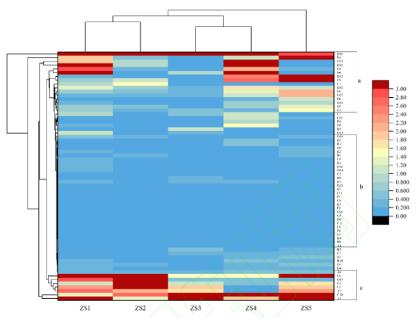 圖6為抓飯主要揮發(fā)性化合物聚類熱圖。通過(guò)顏色變化可直觀看出各抓飯揮發(fā)性風(fēng)味組分間存在差異;通過(guò)化合物聚類結(jié)果可知,化合物相對(duì)含量相似組分大多聚為一類,顏色變化趨勢(shì)基本一致;從上方的聚類來(lái)看,所有的樣品大致可以分為3類:主要體現(xiàn)在a、b、c3個(gè)區(qū)域內(nèi)揮發(fā)性化合物相對(duì)含量的變化;聚類熱圖在主成分分析和相關(guān)性分析上均有較高的響應(yīng)。