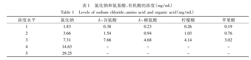 本文選取 L-谷氨酸 ( L-Glu ) 、L-賴氨酸( L-Lys) 、L-檸檬酸(L-Citric)、L-蘋果酸( L-Malic) 為研究對象,以0.03125、0.0625、0.125、0.25、0.50 moL /L( 即 1.83、3.66、7.31、14.63、29.25 mg /mL)的氯化鈉作為反應濃度。將不同濃度的谷氨酸、賴氨酸、檸檬酸、蘋果酸 ( 表 1 所示) 分別添加至1.83、3.66、7.31、14.63、29.25 mg /mL 的氯化鈉溶液當中,配制成 4 組不同的溶液。