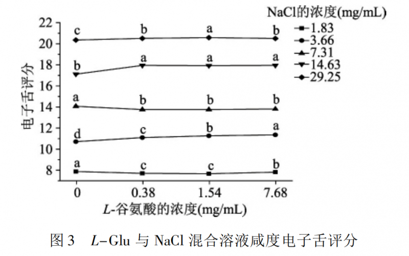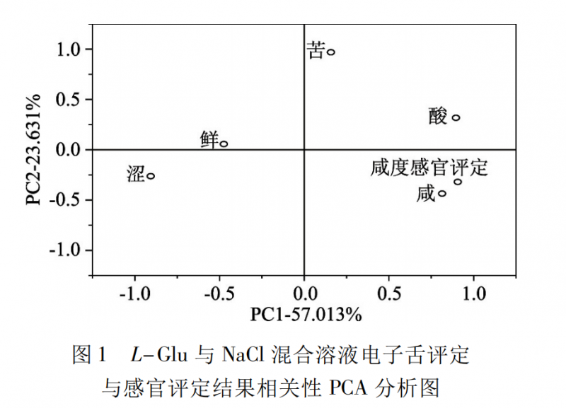 低濃度氯化鈉水平下,谷氨酸對其咸度有抑制效果,但在 3.66 mg /mL 氯化鈉水平下,谷氨酸對其咸度卻有增強作用,而在高濃度氯化鈉水平下,谷氨酸對其咸度有增強作用。谷氨酸對氯化鈉咸度的作用效果受物質(zhì)濃度的影響,研究發(fā)現(xiàn)低濃度的谷氨酸鈉對氯化鈉咸度無影響,高濃度的谷氨酸鈉則對氯化鈉的咸度有增強作用。將 L-谷氨酸與氯化鈉混合溶液咸度的感官評定結(jié)果和電子舌評定結(jié)果進行相關(guān)性分析,發(fā)現(xiàn)其相 關(guān) 性 系 數(shù) r = 0.993 ( p <0.01) 。