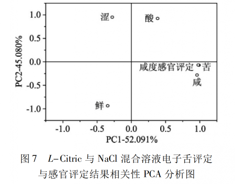 對L-Citric與 NaCl 混合溶液的感官咸度評分和電子舌所測得的咸、酸、苦、澀、鮮五組數(shù)據(jù)進行主成分分析。如圖 7 所 示,PC1 和 PC2 累積方差貢獻率為97.981%,“感官咸度評分”和電子舌數(shù)據(jù)“咸”在圖上位置相近,說明電子舌對溶液咸度的評分“咸”與感官咸度評分相關(guān)性較高。在 PCA 分析圖上,“感官咸度評分”除了與電子舌數(shù)據(jù)“咸”在圖上位置相近之外,還與電子舌數(shù)據(jù)“苦”有著非常近的距離。文中主要研究的是兩種方式對溶液咸度的評定,而沒有將苦味的感官評定和電子舌評定進行比較。在L-Citric與 NaCl 混合溶液味道的電子舌評定中,“苦”味可能受到其他味道的干擾而判斷有誤,導致其在 PCA 圖上與“感官咸度評分”相距很近,但不影響對“感官咸度評分”和“咸”之間相關(guān)性的分析。