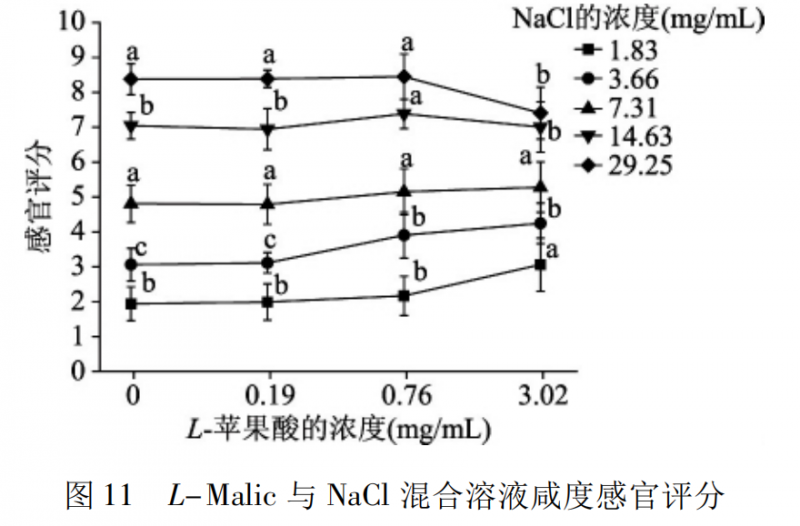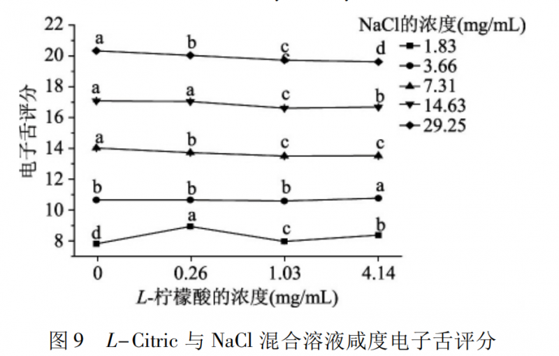 圖8 是 L-Citric 與 NaCl 混合溶液咸度的感官評定結(jié)果。在相同的氯化鈉濃度水平下,添加 0.26 mg /mL L-檸檬酸的混合溶液與氯化鈉溶液的咸度沒有顯著差異( p > 0.05) ,添加 1.03、4.14 mg /mL L-檸檬酸的混合溶液的咸度則顯著高于氯化鈉溶液的咸度( p <0.05) ; 但是在 29.25 mg /mL 氯化鈉濃度下添加4.14 mg /mL L-檸檬酸時,混合溶液的咸度則受到抑制,不同的味道在口中具有不同的傳導途徑,當氯化鈉和檸檬酸的濃度過高時,檸檬酸會對氯化鈉的味覺傳導途徑產(chǎn)生影響,阻礙了氯化鈉咸度的感知。