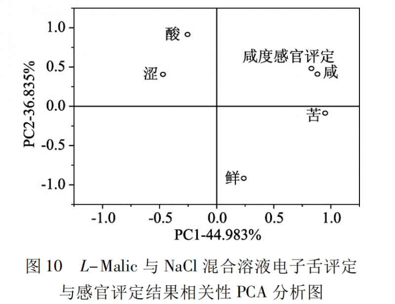 對L-Malic與 NaCl 混合溶液的感官咸度評分和電子舌所測得的咸、酸、苦、澀、鮮五組數(shù)據(jù)進行主成分分析( 如圖 10 所示) 。PC1 和 PC2 累積方差貢獻率為81.818%,“感官咸度評分”和電子舌數(shù)據(jù)“咸”在圖上位置相近,表明電子舌對溶液咸度的評分“咸”與感官咸度評分相關(guān)性較高。