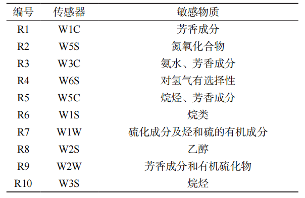 電子鼻配制傳感器對(duì)不同類型化合物響應(yīng)如表 2。