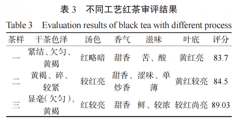 由表 3 可知:三號(hào)茶樣外形緊結(jié)顯毫,湯色紅較亮,滋味鮮濃,香氣給人一種舒適的甜香,葉底紅尚亮;一號(hào)茶樣外形緊結(jié)黃褐欠勻整,湯色較暗,滋味苦中帶酸,葉底黃紅亮;二號(hào)茶樣外形碎、黃褐,湯色較紅亮,甜香中帶有炒香,滋味較單薄,葉底黃紅較亮。