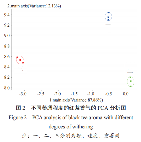 對(duì)不同萎凋程度的紅茶進(jìn)行 PCA 分析(圖 2),得出第一主成分的貢獻(xiàn)率 87.860%,第二主成分貢獻(xiàn)率為 12.134%,總貢獻(xiàn)率為99.994%。主成分分析(PCA)就是對(duì)多指標(biāo)的高維數(shù)據(jù)進(jìn)行降維,提取數(shù)據(jù)中反應(yīng)最大的幾個(gè)特征值對(duì)應(yīng)的特征向量作為主成份,貢獻(xiàn)率越大, 說明該主成分在數(shù)據(jù)信息中越重要,越能最大限度地反映樣本最原始的信息。由圖 2 可知,不同萎凋程度的紅茶香氣成分在類別和含量上有了較大的變化,其中重萎凋在第一、第二主成分上明顯區(qū)別于輕萎凋和適度萎凋,表明重萎凋的工藝使紅茶香氣成分在類別和含量上發(fā)生了較為明顯的變化;輕萎凋和適度萎凋在第一主成分上差異不明顯。整體來(lái)說,萎凋程度不同,使紅茶香氣的成分表現(xiàn)出明顯的差異??芍獏^(qū)分度值越趨近于 1,表明兩種物質(zhì)差異越明顯。表4中區(qū)分值都在99%以上,表明 PCA 可以將不同萎凋程度的紅茶區(qū)分開。
