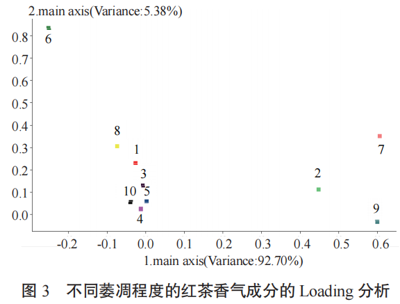 Loadings 分析,反映的是不同傳感器在紅茶香氣的區(qū)分中其貢獻(xiàn)的大小,一般通過傳感器在圖中的位置來(lái)判斷其貢獻(xiàn)的大小。傳感器與原點(diǎn)的距離越近,說明傳感器對(duì)樣品分析起到的作用越小,反之則表示作用越大。由圖 3 可得第一主成分起主要作用,這和 PCA 分析所得結(jié)論相同,R7 和 R9 傳感器對(duì)第一主成分貢獻(xiàn)率最大,R2 次之;R6 傳感器對(duì)第二主成分貢獻(xiàn)率最大,R8 次之。R4、R5、R10 傳感器負(fù)載較低,表明其對(duì)茶葉香氣成分敏感度較低。Loadings 分析表明在不同萎凋程度的紅茶區(qū)分中硫化物、芳香型化合物、氮氧化合物以及烷類、醇類化合物對(duì)區(qū)分貢獻(xiàn)有主要作用。