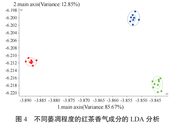 LDA 更側(cè)重于同一類別的空間分布狀態(tài)和距離的精度。LDA 分析是在 PCA 分析后對(duì)傳感器響應(yīng)紅茶香氣成分的優(yōu)化,通過擴(kuò)大差異更直觀的表現(xiàn)不同提香工藝紅茶香氣之間的區(qū)別。圖 4 中第一主成分貢獻(xiàn)率為 85.67%,第二主成分貢獻(xiàn)率為 12.85%,總貢獻(xiàn)率為98.52%,能很好的反應(yīng)紅茶香氣的信息。由圖4 得知,重萎凋與其他兩組距離較遠(yuǎn),可以在線性判別分析完全區(qū)分開;而在第一主成分的貢獻(xiàn)率中,輕萎凋和適度萎凋相差不大,這與 PCA 分析以及感官審評(píng)結(jié)果一致,表明這兩種萎凋程度對(duì)茶葉香氣的改變差異較小。整體結(jié)果對(duì)比 PCA 分析較為相似,說明電子鼻在區(qū)分不同萎凋程度的紅茶香氣中具有可行性。