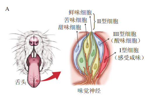 味蕾是人體的味覺感受器,其超微結(jié)構(gòu)含有多種味覺細(xì)胞,負(fù)責(zé)感受甜、苦、咸、酸和鮮等風(fēng)味,在味覺感知的過程中起關(guān)鍵作用。味蕾的超微結(jié)構(gòu)如圖1A所示,苦、甜和鮮味刺激由II型細(xì)胞檢測,酸味刺激由III型細(xì)胞檢測,而檢測咸味刺激的味蕾細(xì)胞尚未明確,Chandrashekar等通過對嚙齒類動物味覺細(xì)胞的研究發(fā)現(xiàn),咸味的感知主要與I型類膠質(zhì)細(xì)胞有關(guān)。咸味的感知途徑為刺激物作用于味覺細(xì)胞的頂端致使細(xì)胞膜發(fā)生去極化,產(chǎn)生動作電位,從而釋放神經(jīng)遞質(zhì)并發(fā)生傳遞,最終傳入神經(jīng)反饋大腦。刺激物的不同,所引導(dǎo)的感知與傳遞不同。目前常見的咸味刺激物主要是以NaCl為主的金屬鹽類,但隨著研究的不斷深入,非金屬離子的咸味刺激物不斷涌現(xiàn)。非金屬離子類刺激物非金屬離子的咸味刺激物以氨基酸、核苷酸和小分子多肽為代表,其涉及受體和咸味傳導(dǎo)途徑復(fù)雜。