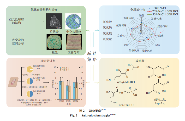 要達(dá)到“減鹽不減咸”的目的,可以基于以上咸味傳導(dǎo)途徑的特點,從多方面、多角度減少Na+過量攝入。如通過設(shè)計食物中Na+分布等,提高咀嚼過程中Na+在口腔中的釋放速率;或者使用非Na+的金屬鹽代替NaCl作為咸味調(diào)味品;除此之外,還可使用非離子型的風(fēng)味促進(jìn)劑,如咸味香精、咸味肽等提高咸味的感知。目前常見的減鹽策略如圖2所示。