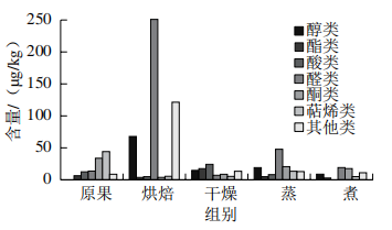 圖1表明,干燥后的揮發(fā)性物質(zhì)相對于原果都有一定幅度的減少,例如醇類、酯類、酸類、萜烯類減少是由于干燥后烯烴類遭到破壞,同時(shí)可以看到沙棗中的醛類物質(zhì)較多,尤其是在烘焙處理中含量最多,醛對棗果實(shí)的風(fēng)味有顯著影響。