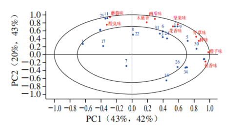 特征香氣強(qiáng)度相應(yīng)值與感官特征參數(shù)相關(guān)性分析結(jié)果 PLSR是一種基于因子的多元回歸將數(shù)據(jù)分解為不同PC,并建立預(yù)測校準(zhǔn)模型的方法。如圖6所示,位于同一象限的樣本之間相關(guān)性較強(qiáng),感官屬性與同象限變量相互接近,具有正相關(guān),與對角象限中的變量,具有負(fù)相關(guān)。PLSR模型解釋了63%的X變量和85%的Y變量。青草香、花香的屬性與壬醛(9)、2-壬酮(5)4-(2-呋喃基)-3-丁烯-2-酮(29)、壬醛(6)呈正相關(guān)、焦香的屬性與2,6-二甲基吡嗪(4)、糠醇(20)、2-吡咯甲醛(34)呈正相關(guān),與己酸(25)、庚酸(11)、1-辛烯-3-醇(10)呈負(fù)相關(guān),而這3種物質(zhì)對蘑菇味和酸臭味的屬性具有正向影響,這些與感官評價(jià)結(jié)果中的感官評分具有很好的一致性(圖2)。
