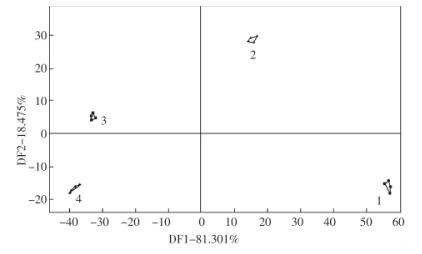 電子舌檢測不同菌菇魚松樣品的PCA和DFA分析圖見圖5和圖6。兩圖的總貢獻(xiàn)率均超過85%,表明試驗方法的可行性。由圖5可知,第一主成分的貢獻(xiàn)率為85.037%,第二主成分的貢獻(xiàn)率為9.557%,這兩種主要成分的累積貢獻(xiàn)率為94.594%,說明這兩種主成分包括菌菇魚松滋味物質(zhì)的大部分信息。從PCA分析圖譜中可以看出,魚肉松和金針菇魚松分布在PCA上側(cè)部分,杏鮑菇魚松和香菇魚松分布在PCA下側(cè)部分,而且4種樣品互相之間沒有重疊,說明菌菇魚松的滋味各不相同。