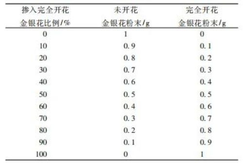 未開花與完全開花金銀花打粉,過4號(hào)篩,取過篩后的未開花與完全開花金銀花粉末調(diào)配為總量為1g待測(cè)樣品,充分震蕩混勻,具體調(diào)配比例見表1,并以此分組。