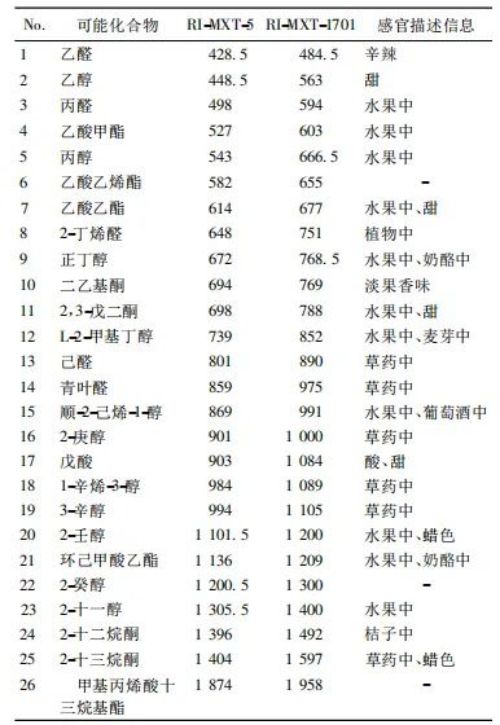 HeraclesⅡ超快速氣相色譜電子鼻具有兩根極性存在差異的色譜柱,即MXT-5(低極性)和MXT-1701(中極性),扣去空白參考后,各比例金銀花粉末色譜圖見圖1,2。不同比例金銀花粉末色譜圖中的色譜峰位置基本未發(fā)生變化,說明其基于氣味的定性較為類似,將保留時(shí)間轉(zhuǎn)換為Kovats保留指數(shù)后,經(jīng)AroChembase數(shù)據(jù)庫(kù)得出定性結(jié)果,見表3。