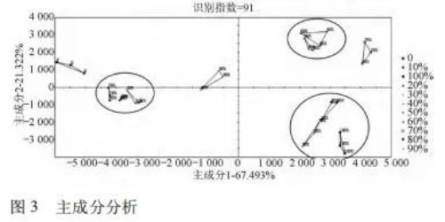PCA是將所得的數(shù)據(jù)進(jìn)行降維,提取幾個(gè)特征值較大能反映樣本信息變量的因子進(jìn)行線性分類,以得到具有不同氣味區(qū)域和簇的描述性圖表。在經(jīng)過超快速氣相電子鼻檢測(cè)得到不同調(diào)配比例金銀花粉末的色譜峰面積以及峰數(shù)量后,篩選出區(qū)分能力強(qiáng)(>0.900)且峰面積較大(range>1000)分離效果較好的色譜峰作為傳感器,進(jìn)行PCA分析,得出主成分1與主成分2累計(jì)貢獻(xiàn)率88.815%,能夠較好地反映所測(cè)樣品中氣味信息。識(shí)別指數(shù)91,說明超快速氣相電子鼻可有效區(qū)分不同調(diào)配比例金銀花粉末,見圖3。此外,10%~20%,20%~30%,50%~60%,80%~90%,90%~100%間區(qū)分較為困難。據(jù)此,可將不同調(diào)配比例金銀花粉末可分為6類,即①0;②10%,20%,30%;③40%;④50%,60%;⑤70%;⑥80%,90%,100%。