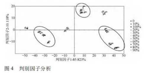DFA是在主成分分析的基礎(chǔ)上,縮短組內(nèi)樣品間距離,增大組間差距。因此,本研究以主成分分析中所采用的傳感器,進(jìn)行判別因子分析,結(jié)果見圖4。由此可知,各調(diào)配比例的金銀花粉末可通過超快速氣相電子鼻進(jìn)行快速鑒別,而且區(qū)分效果較好,所得趨勢(shì)及結(jié)果與主成分分析基本相同,使PCA結(jié)果得到進(jìn)一步驗(yàn)證。